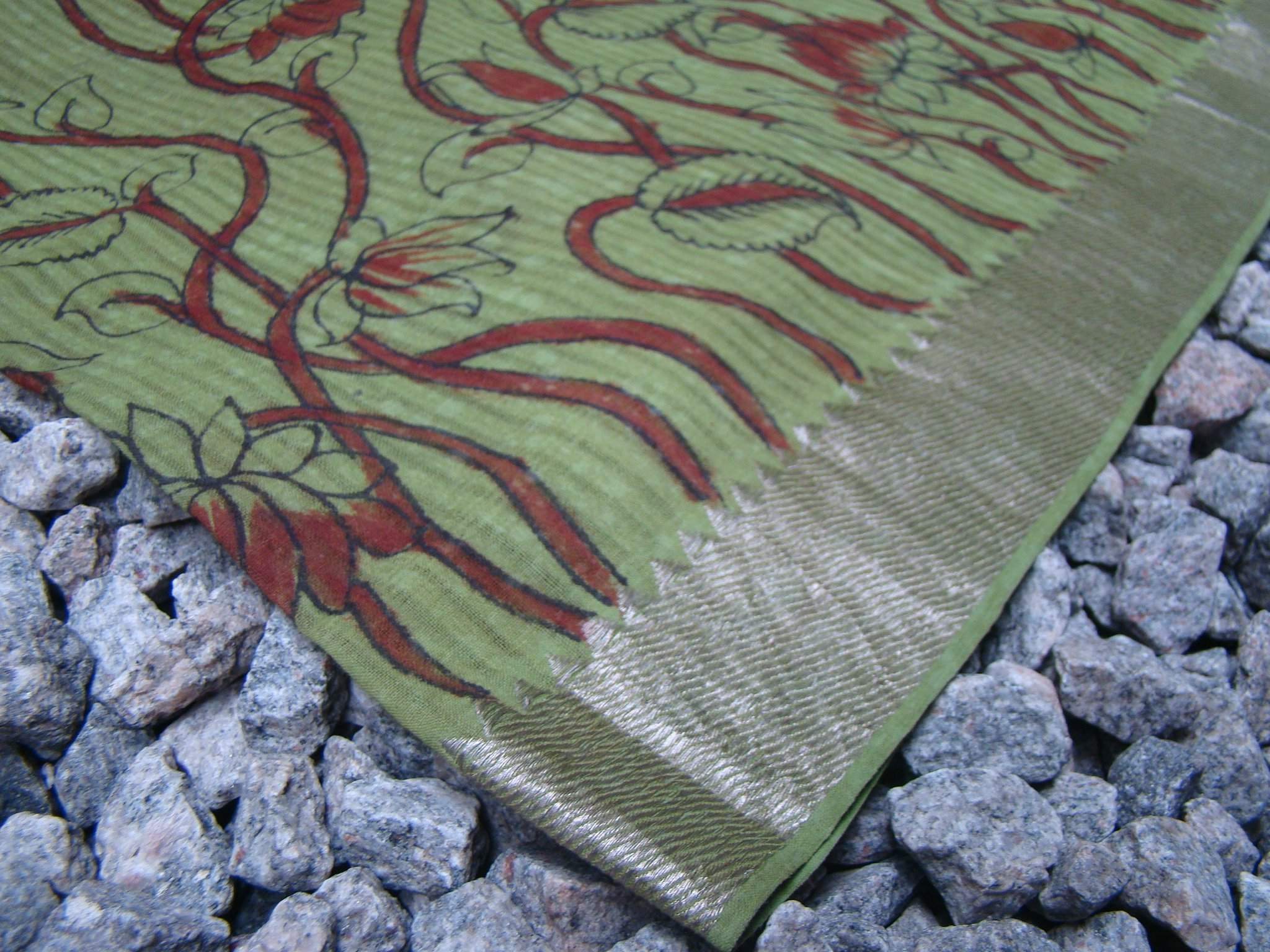 Kalamkari comes from the term "kalam" or pen is used for free hand drawing of the subject and filling in the colors and is done entirely by hand.