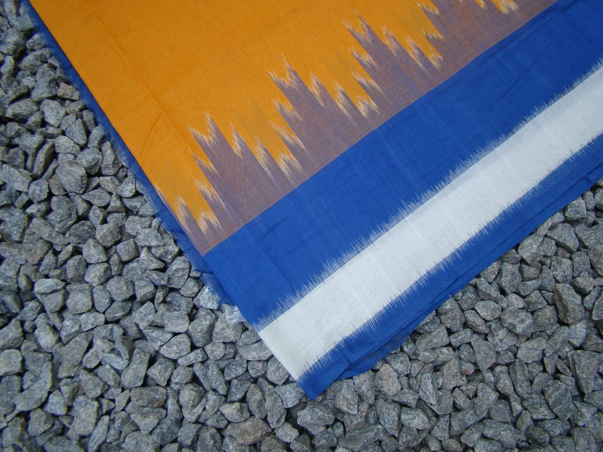 Mustard/Blue/White Ikat Cotton Saree